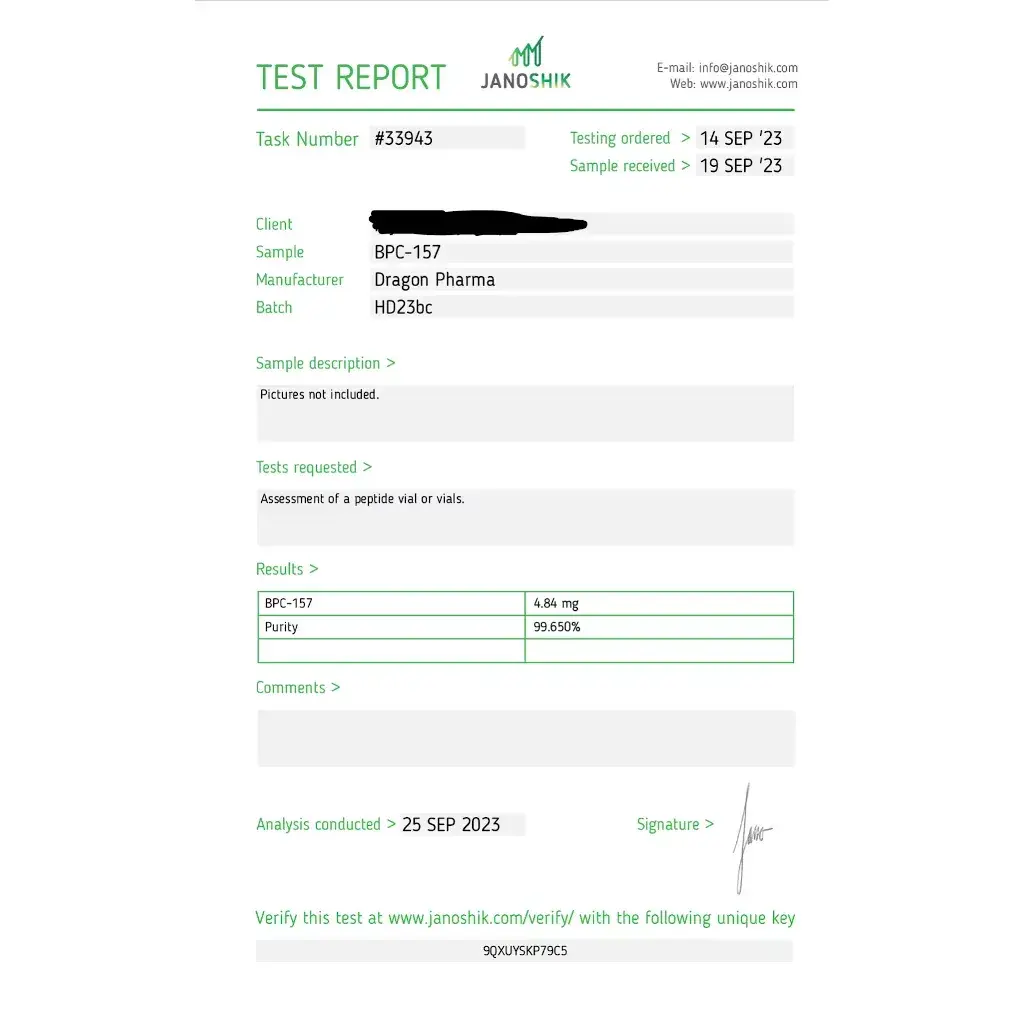 To help verify authenticity, buy only from trusted sources that preserve proper storage conditions and provide batch-related quality information. This product page also includes third-party lab results showing recent measured content for Dragon Pharma BPC 157.