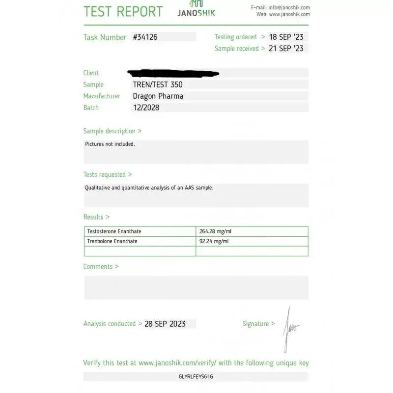 Tren/Test 350 is a pharmaceutical product available in a 10 mL vial, comprising Trenbolone Enanthate (100 mg) and Testosterone Enanthate (250 mg). It is manufactured by Dragon Pharma.